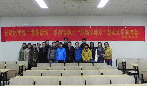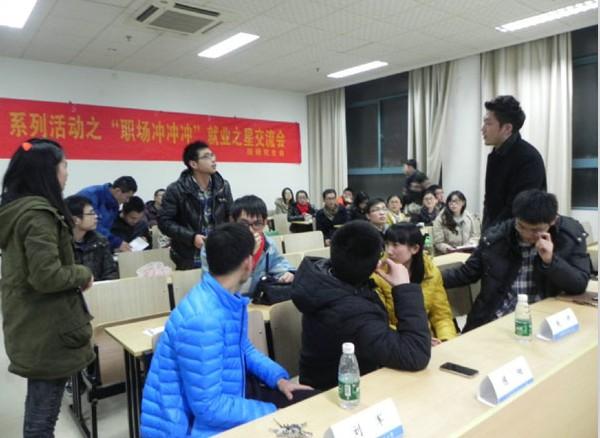 12月17日晚7点,由开云kaiyun官方网站研究生会主办的“紫冬话坊”系列活动之“职场冲冲冲”就业之星交流会在A18楼218教室成功举办。本次活动有幸邀请到开云kaiyun官方网站2011级硕士生梁�、刘军、陈阳、邢栋、宋普庚和赵妍六位就业之星与到场同学进行交流,研究生辅导员刘斐文也莅临现场出席了本次活动。