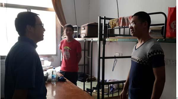 迎新过程中,开云kaiyun官方网站副院长赖际舟来到迎新现场视察指导工作,并亲切慰问了在现场的工作人员。随后赖院长走访了学生宿舍,与研究生新生同学进行了亲切地沟通交流,了解新生们的思想和生活现状,嘱咐新生尽快地适应研究生生活,得知有新生刚入校因运动而骨折,院长关心了解其日常起居生活,希望其尽快康复,尽快投入到研究生的学习生活中。