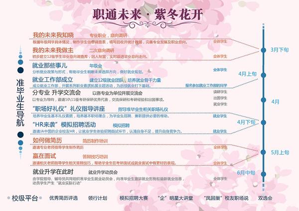 宣讲会开始前,每位到场的同学都领到了一份以“职通未来•紫冬花开”为主题的纸质版职业素质拓展季方案及大四学年考研就业时间轴。陶琨老师对这份2012级定制版职业素质拓展季方案进行了解读,其中对“在接下来的一年里,你应该做什么,你还能做什么”的解析引发同学的思考与重视,并展示了部分年级调研结果,以帮助准毕业生明晰未来选择方向,做好就业准备。