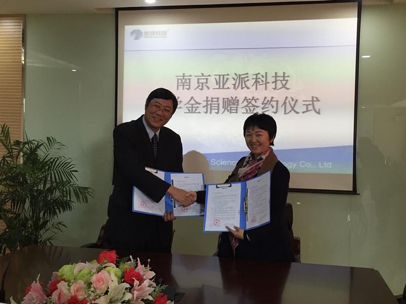南京亚派科技股份有限公司总经理葛文海、我院党委副书记沈伯秀代表双方签订协议。南京亚派科技股份有限公司将出资20万元分5年资助开云kaiyun官方网站电气相关专业学习成绩优异、且家庭经济困难的本科生和硕士研究生。