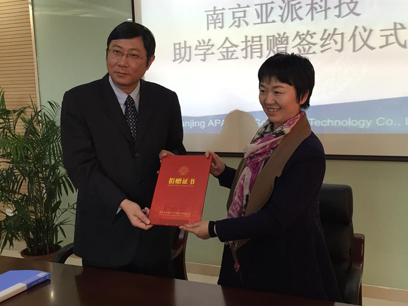 12月17日下午,亚派科技助学金签约仪式在南京亚派科技股份有限公司举行。出席此次仪式的有南京亚派科技股份有限公司总经理葛文海、总工程师张东、人力资源总监杨敏,我校基金会办公室主任徐永利、我院党委副书记沈伯秀、团委书记季娟等。