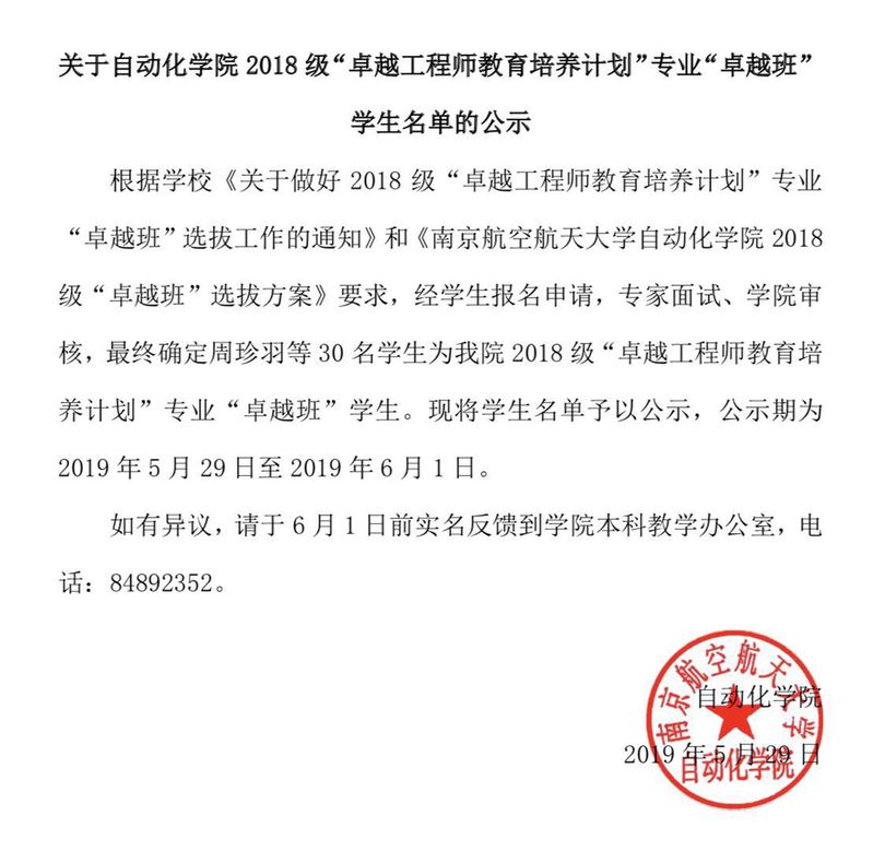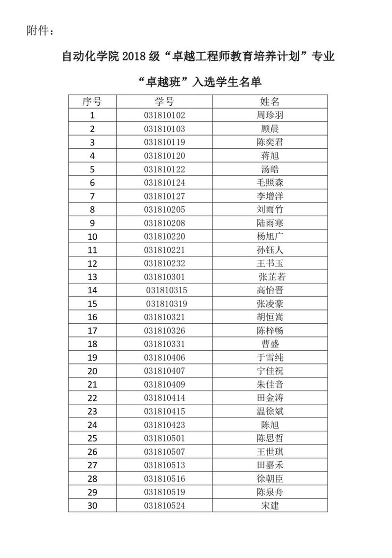 关于开云kaiyun官方网站2018级“卓越工程师教育培养计划”专业“卓越班”学生名单的公示