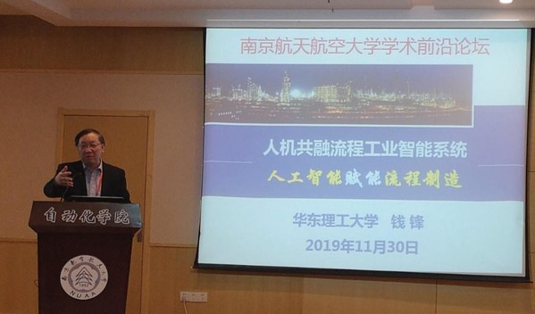 院钱锋院士做了《人机共融流程工业智能系统-人工智能赋能流程制造》的报告。钱院士针对流程制造的发展现状和需求,阐述了流程制造高质量转型发展和人工智能赋能制造业两者相互融合的必要性,深度分析了我国流程工业转型升级重大需求,探讨实现价值流、物质流、能量流和信息流“四流合一”的智能优化制造愿景,并围绕人工智能与流程制造深度融合实现智能优化制造等科学问题,并给出了工程应用示例。