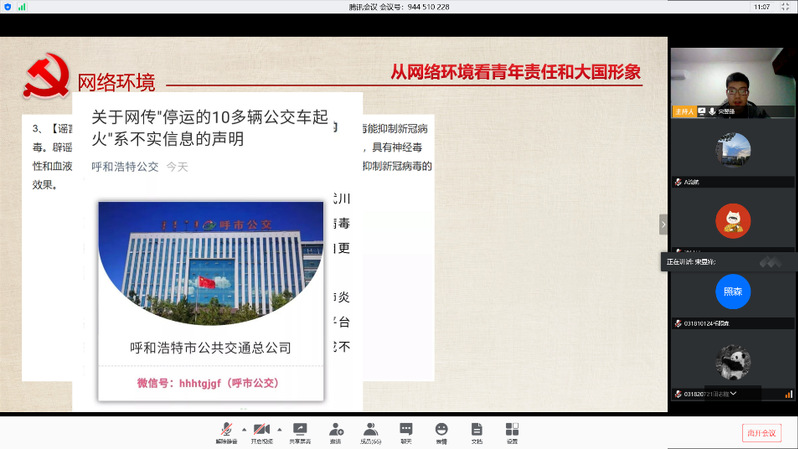 本次“微党课”由本科2018级预备党员宋昱锋同志主讲。支部全体党员、发展对象和部分入党积极分子线上参与了本次党课。宋昱锋同志结合疫情期间谣言盛行和人云亦云的网络现象与大家进行了交流,深入探讨了面对纷乱的网络环境,新时代新青年如何正确认识青年责任和大国形象。