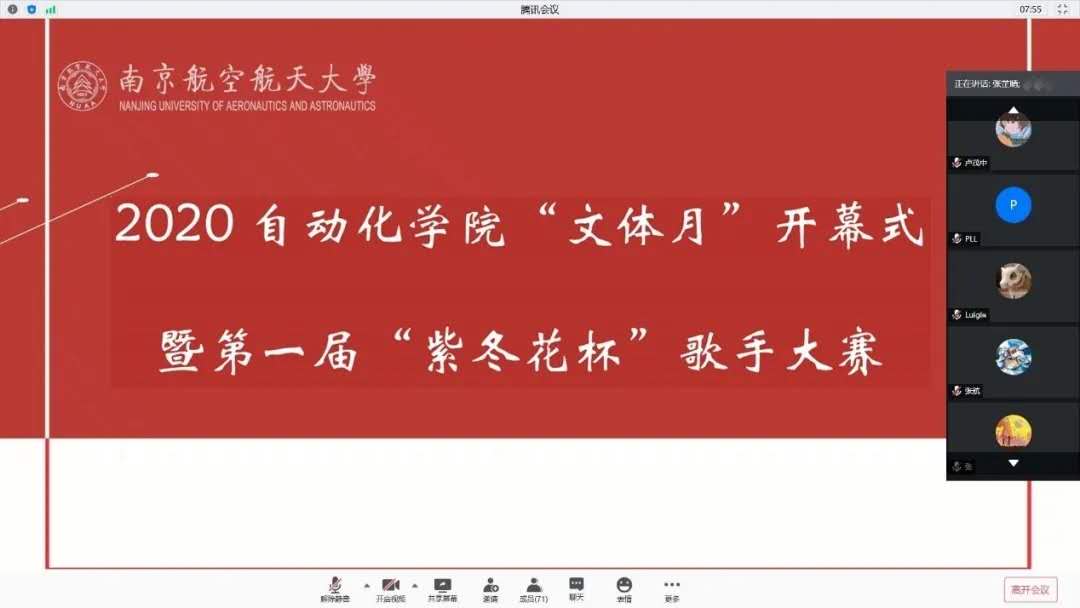 2020年6月6日下午15:00,开云kaiyun官方网站第十四届“文体月”开幕式暨第一届“紫冬花杯”歌手大赛初赛顺利举行。受疫情影响,本届“文体月”活动采取线上举办的方式。学院党委副书记张跃老师、院团委书记陈慧云老师、研究生辅导员汤呈懿和王明月老师、本科生辅导员汪明锐和宋欣老师作为嘉宾线上出席了本次开幕式。