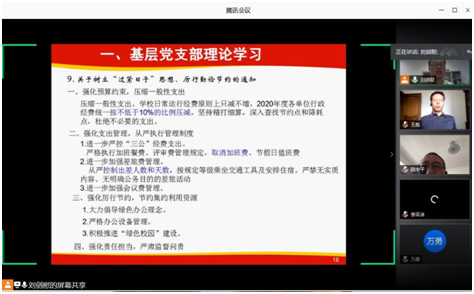 首先,刘剑慰同志按照校党委组织部发布的6月份基层支部理论学习清单,带领全体支部党员就两会精神、“习近平总书记给袁隆平、终南山、叶培建等25位科技工作者代表的回信”、以及“关于树立“过紧日子”思想、历行勤俭节约的通知“等文件进行了学习。