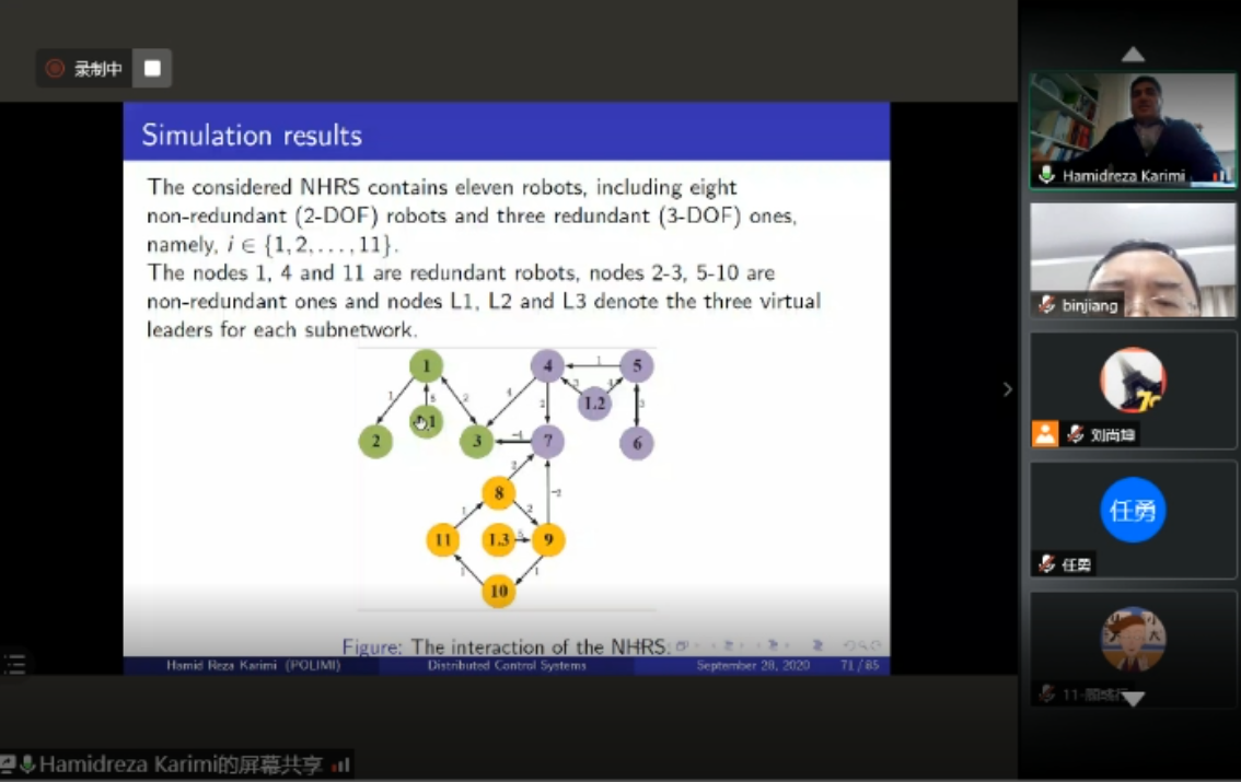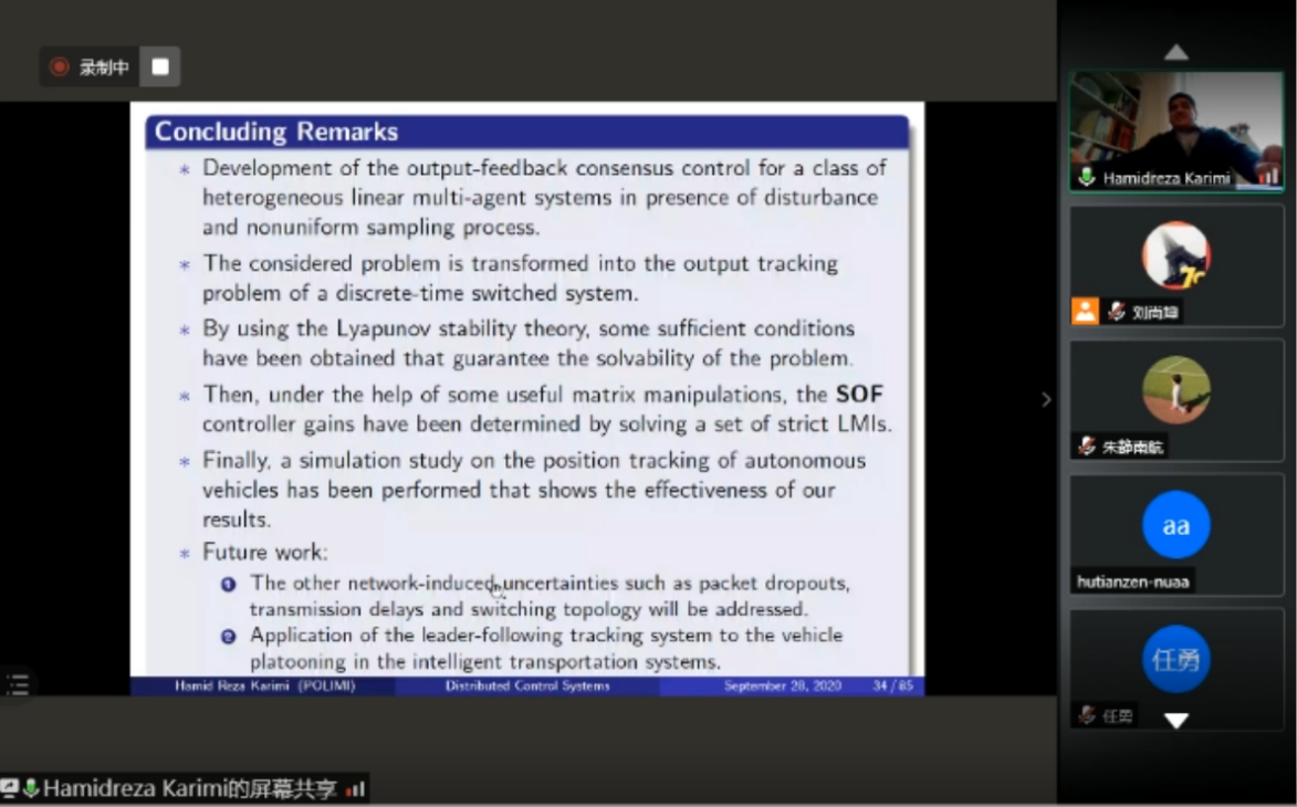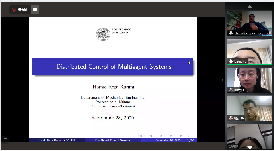 928日下午,意大利米兰理工大学Hamid Reza Karimi教授应我校国际合作处和我院的邀请,通过腾讯会议作了题为“Distributed Control of Multiagent Systems”的线上学术报告,报告由我校副校长姜斌教授主持,学院师生在线参加会议。参会师生对Hamid Reza Karimi教授的交流分享表示热烈欢迎。