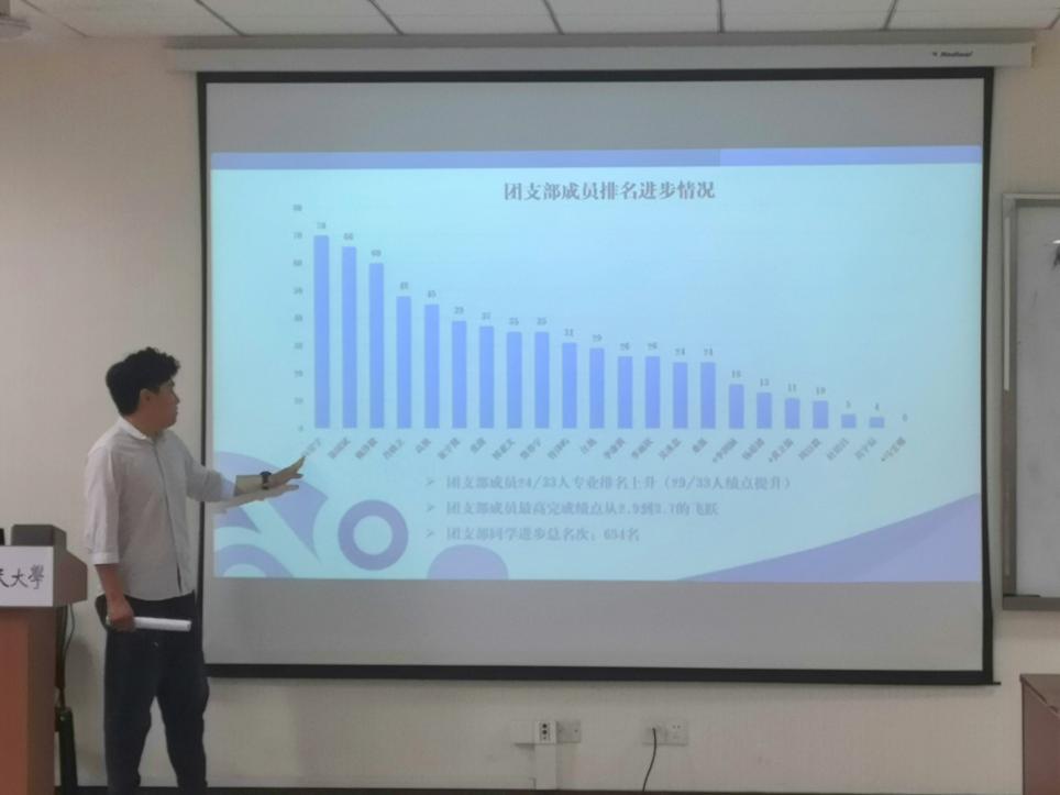 班长桑强对支部一年来的建设情况进行主题汇报在支部建设、学风建设上成果显著。班级篮球赛、一支部一项目等活动使支部成员更加紧密地结合在一起,团支部工作交流会使支部运行更加高效,“干部带头,互帮互助,高效学习,交流心得”的学习模式使支部成员成绩显著提高。面对现阶段大部分成员考研压力大的情况,支部成员更是互帮互助,彼此鼓励。