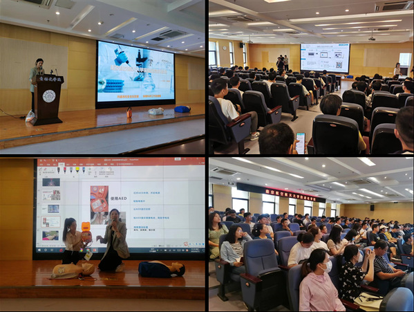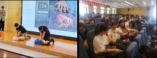 在场师生们聚精会神,认真学习。在模拟演练环节,大家热情高涨,踊跃参与互动环节,分组互相进行了清洗消毒、止血包扎等基本技能的操作演练,并在傅老师的指导下模拟心脏复苏操作流程,将理论方法与实际操作相结合,使得各位老师和同学熟练掌握了急救要领,取得了很好的培训效果。
