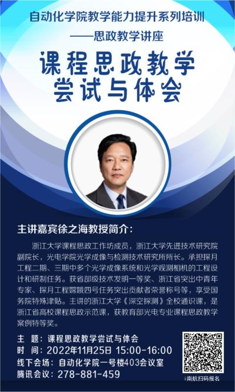 2022年11月25日下午,我院邀请到浙江大学徐之海教授作题为《“课程思政”教学尝试与体会》的线上专题讲座。本次讲座由开云kaiyun官方网站副院长魏佳丹主持,学院党委书记李文雷、院长陈谋、各系所中心教学副主任、近三年入职青年教师和教学办全体老师出席活动。讲座采取线上、线下相结合的方式,全校50余名专任教师听取了报告。