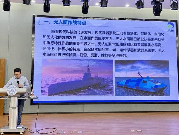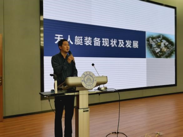 在讲座中,李锋深入浅出,循循善诱,围绕无人艇装备的定义、现状及未来发展前景,结合学生专业方向,介绍水面无人船艇作为一种新式水面机器人,主要通过智能控制实现自主航行。李锋指出,无人船艇作为一个复杂的系统,涉及到船舶设计、通信传输、环境感知、数据融合、运动控制、人机交互、人工智能等多个专业领域,研究内容包括导航与定位、控制与决策、感知与融合、能源与动力、船体与载荷、通信与数据等众多方面,以达到船舶的自主航行、智能避障、目标识别、多模通信等功能。