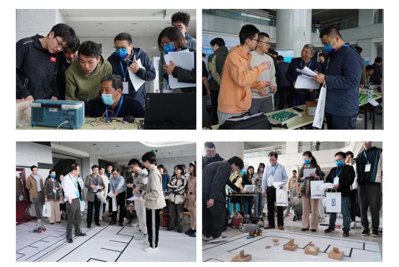 决赛现场,参赛队伍在一号楼大厅做作品展示。本场决赛邀请了解放军陆军工程大学潘克修教授等6位校外专家和10位校内专家组成评委团。决赛现场,评委们从作品完成度、技术指标、创新性等多个角度对各参赛作品进行评审,并与同学们深入交流,指导他们提升专业能力。
