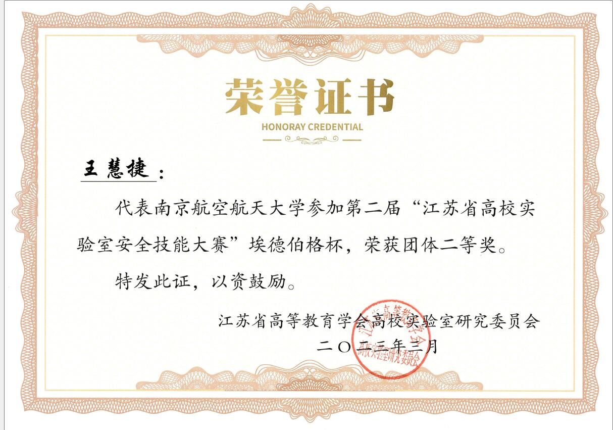 近日,江苏省高校实验室研究会举行第二届“江苏省高校实验室安全技能大赛”颁奖典礼,学院生物医学工程系青年教师王慧捷作为参赛选手代表学校参赛,并荣获大赛二等奖。