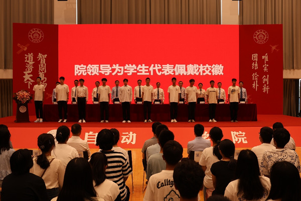 学院领导为新生代表佩戴校徽,校徽蕴含着自豪、荣耀和归属感。佩戴上校徽代表着新生们作为南航人将肩负起“效法羲和驭天马,志在长空牧群星”的使命与担当。