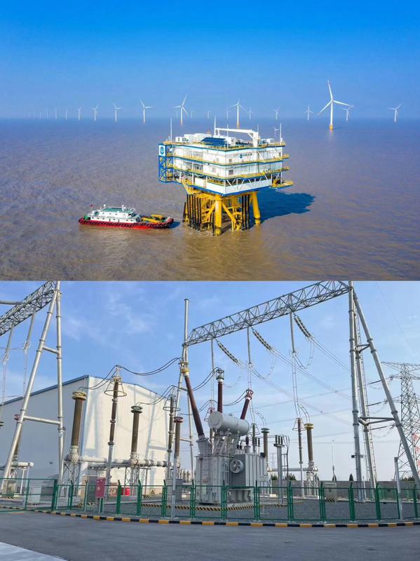 三峡集团江苏如东海上风电项目位于如东县东部黄沙洋海域,离岸直线距离约50-65km,水深9-22m,项目总装机容量1100MW,其中H6、H10项目各安装100台4MW风机,H8项目安装25台4MW风机和40台5MW风机。三个海上风电场配套建设三座220KV海上升压站,一座海上换流站及一座陆上换流站。每个风电场通过35KV集电线路汇集接入各自配套的海上升压站,每座海上升压站通过2回220KV交流海缆接入海上换流站,整流后通过±400KV直流海缆接入路上换流站,再逆变为500KV交流电,经过1回架空线路接入500KV骥能变。项目在实施过程中使用了大量的技术创新工艺,包括关键设备,施工工艺等,采用的国产IGBT部件、±400kV直流海缆、浮托安装法等设备和技术均是国内海上网电首次创新应用,建成了当前世界容量最大、电压等级最高的海上风电柔性直流输电工程,对我国远海大容量海上风电开发建设具有重要示范意义。