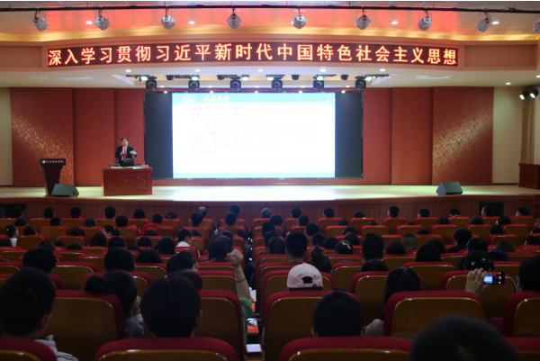 曾教授从中国特色社会主义的提出、发展,习近平新时代中国特色社会主义思想的形成、体系以及如何学习习近平新时代中国特色社会主义思想等方面给大家作了精彩讲授。他指出,从中共十二大首次提出中国特色社会主义到党的十九大中国特色社会主义进入新时代这一发展过程是中国特色社会主义演变、拓展、升华的过程,党的十九大形成了习近平新时代中国特色社会主义理论思想这一新理论、新思想。他讲到,新时代的“新”体现在综合国力迈上新台阶、人民生活水平实现新跨越、引领世界发展新潮流、形成风清气正的新环境、提出新目标、绘就新蓝图。他强调,习近平新时代中国特色社会主义思想理论的内容丰富、完整体系,是不断发展的,要学习和深刻把握习近平新时代中国特色社会主义思想的关键就是要抓住其精髓,要解放思想、实事求是、与时俱进、求真务实,要认真学习新知识,深刻把握新思想,科学运用新理论,努力取得新成就,把习近平新时代中国特色社会主义思想与实际的工作、生活相结合,不断学、反复学、深入学,学深悟透,融会贯通,真正把握“为人民谋幸福、为民族谋复兴、为世界作贡献”这一思想的精髓。整个报告会鸦雀无声,曾教授的报告内容丰富、语言幽默、形式活跃,与会人员聚精会神地听取报告,会场洋溢着浓厚的学习氛围。
