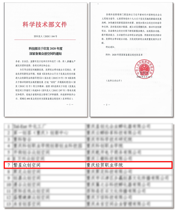 2020年4月23日,科技部印发《关于印发2020年度国家备案众创空间的通知》(国科发火〔2020〕104号),beat365繁星众创空间获批国家备案众创空间,成功晋级“国家队”。本次,重庆市众创空间有13家晋升“国家级”,其中高校2家。